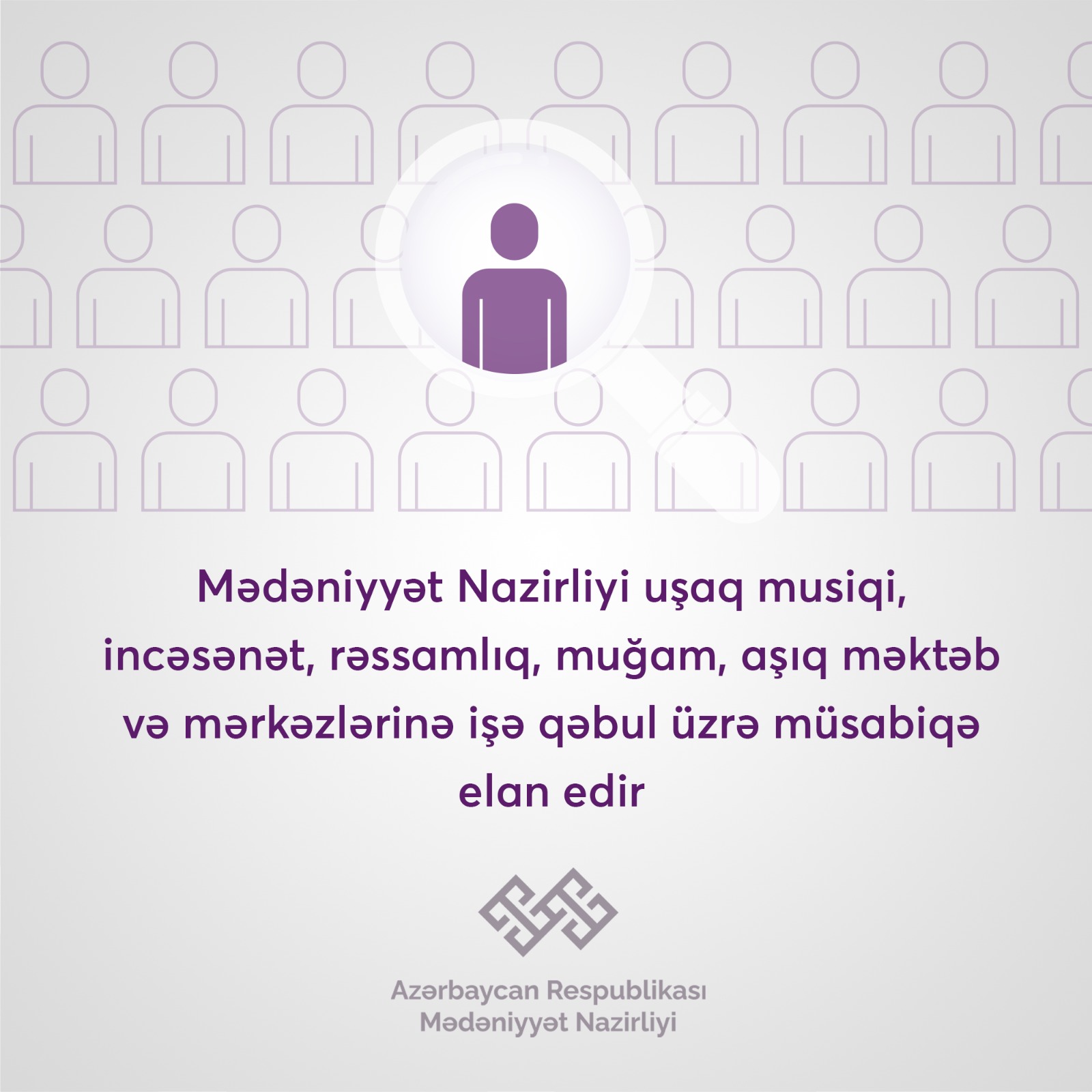 Azərbaycan Respublikasının Mədəniyyət Nazirliyi uşaq musiqi, incəsənət, rəssamlıq, muğam, aşıq məktəb və mərkəzlərinə direktorların, direktor müavinlərinin və müəllimlərin işə qəbulu üzrə müsabiqə elan edir.